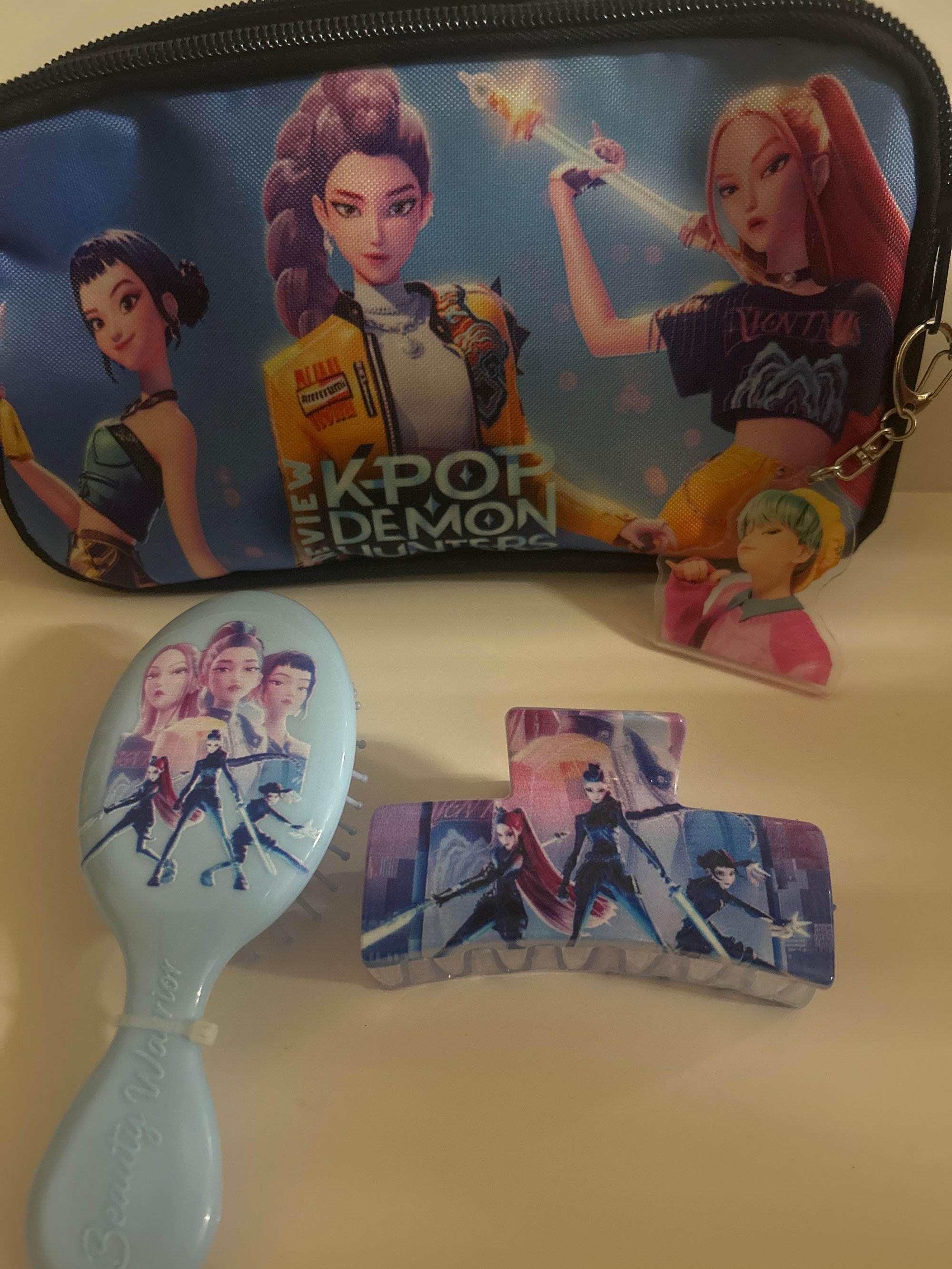 K-pop makeup bag includes the cutest keychain a on the go mini brush and a character hair clip. The cutest must have for your K-pop girlies. Be sure to grab yours while they last. 🛍️💞🛍️